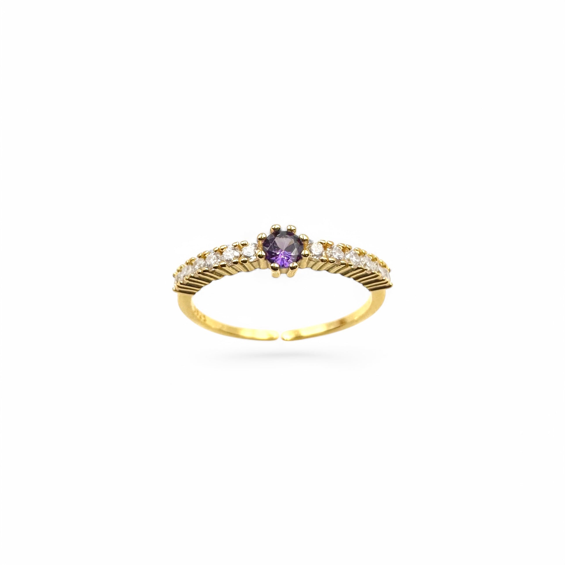 Introducing our beautiful Amethyst & Crystal Daphne Ring. This elegant ring features a purple cubic zirconia crystal surrounded by a half band of clear cubic zirconia crystals.