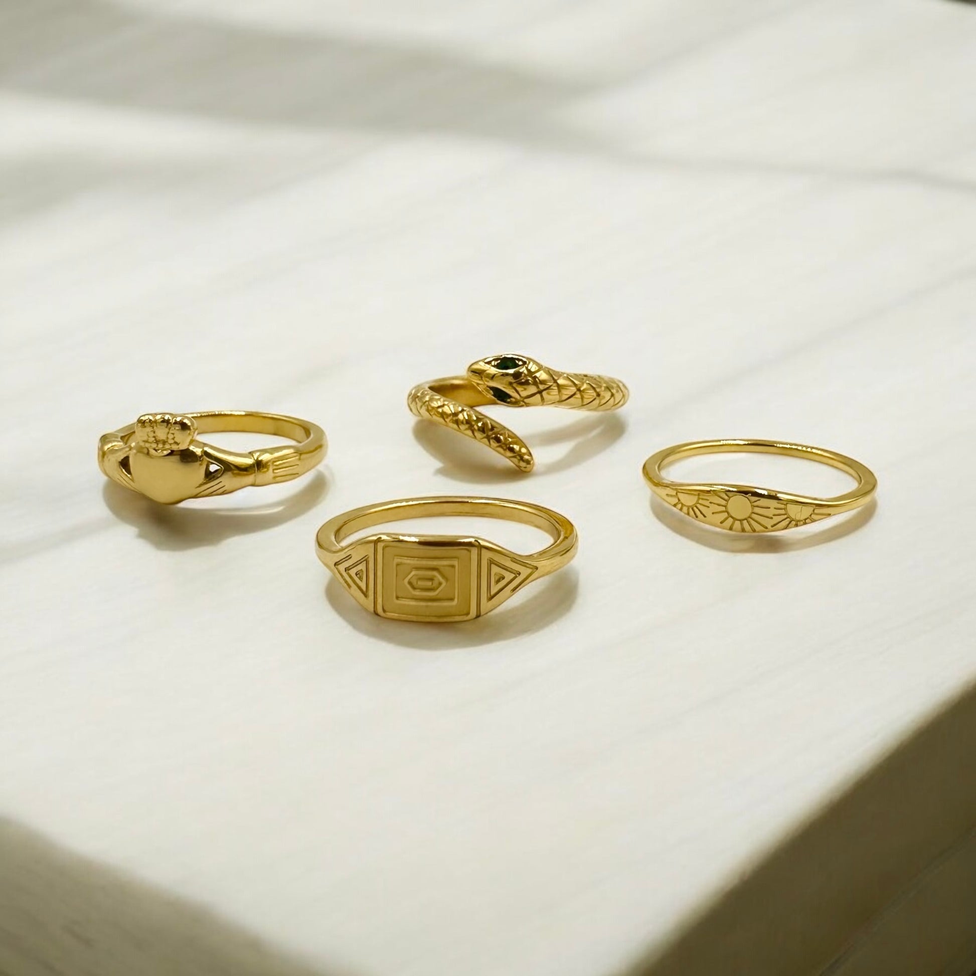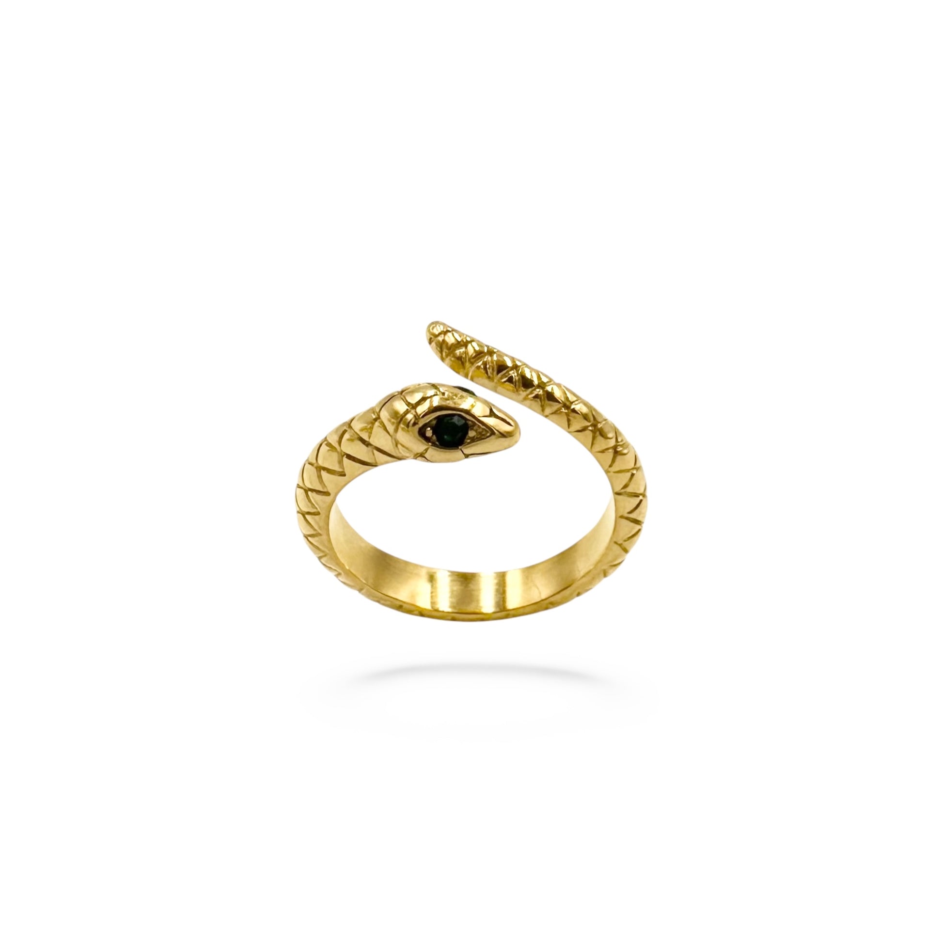 An instant favourite! Our Simple Snake Ring is crafted from high quality stainless steel filled with 18k gold with green cubic zirconia crystals for eyes.