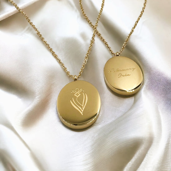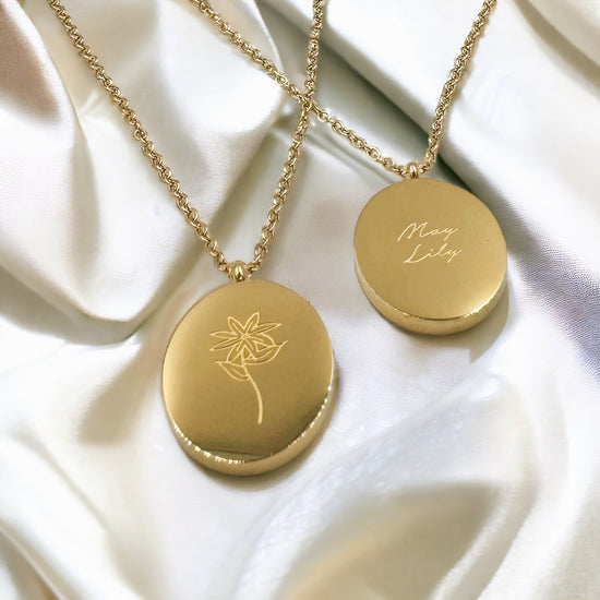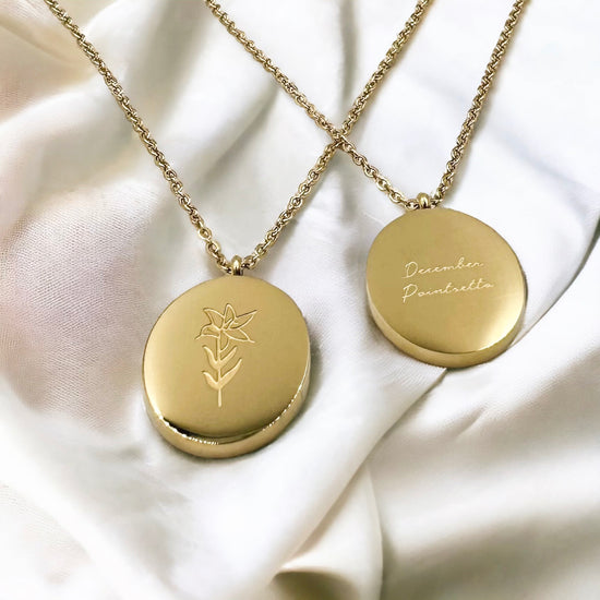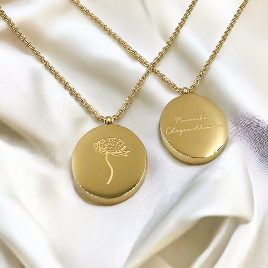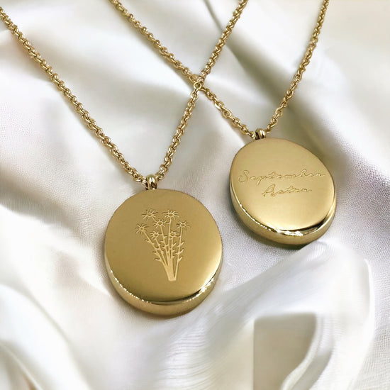 Our stunning Birth Flower Necklace is reversible, one side features a detailed birth flower drawing and the other side features the birth month and birth flower names, handwritten.