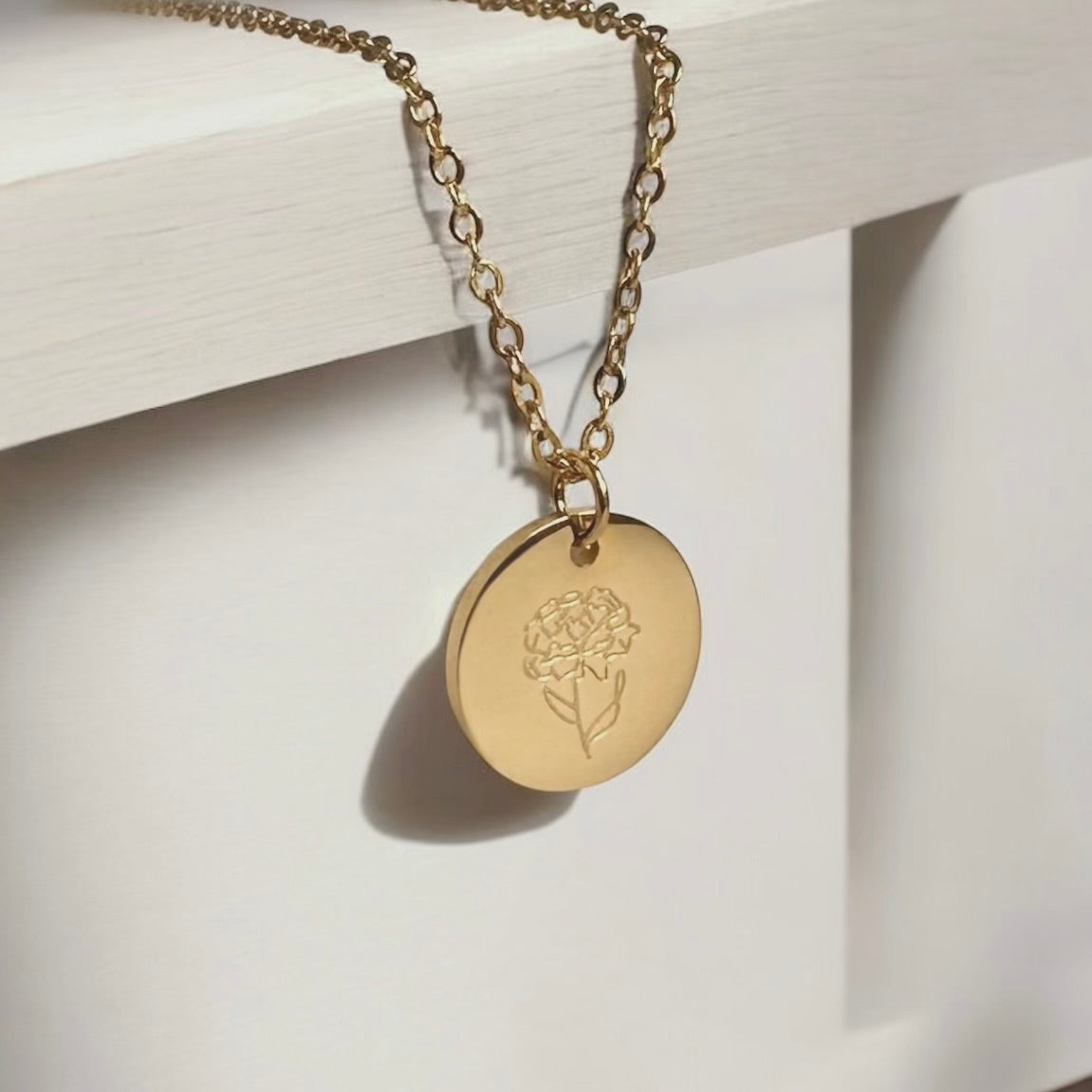 A new, dainty take on our ever popular Birth Flower Necklaces! This new style, made of 18k gold filled stainless steel (aka waterproof & hypoallergenic), features an 18” chain and a 1.5cm round pendant.