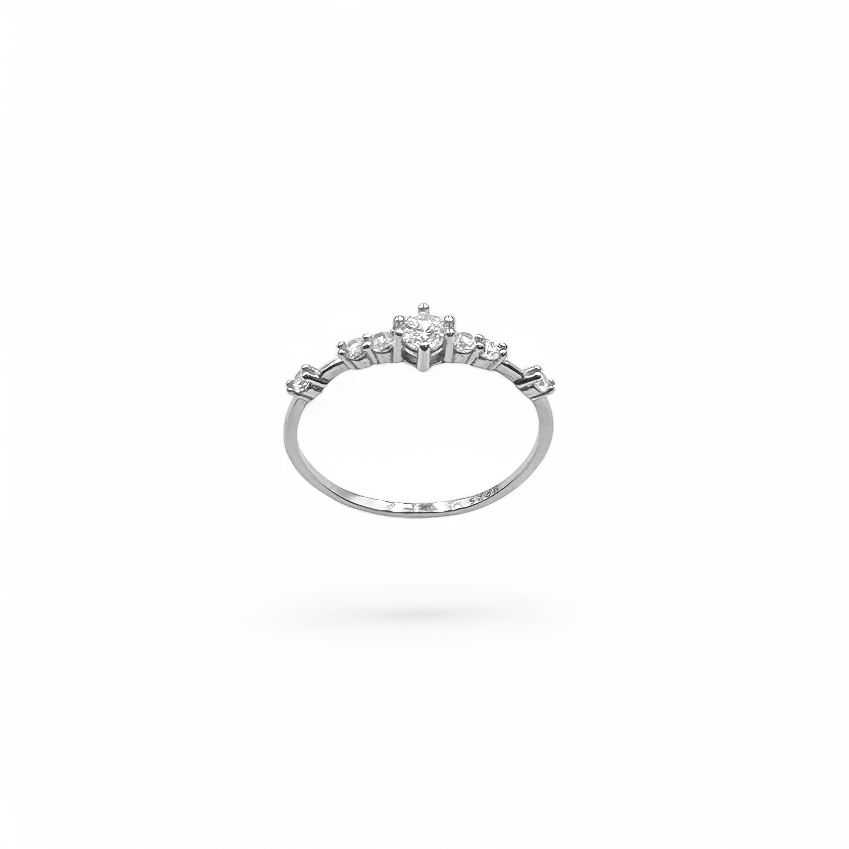 Introducing our Dainty Delilah Ring. This adorable ring features 7 clear cubic zirconia crystals set upon an extremely elegant band.