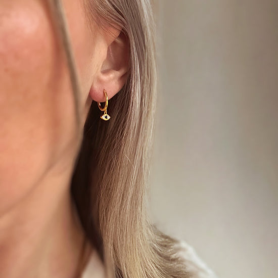 Stay protected with our dainty and elegant Evil Eye Hoops, available in plain sterling silver, and with long lasting 18k gold fill.