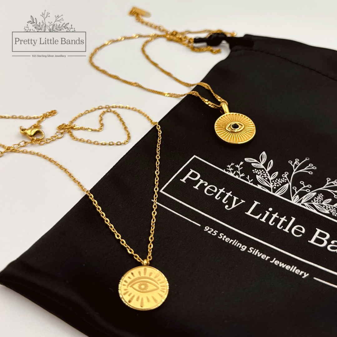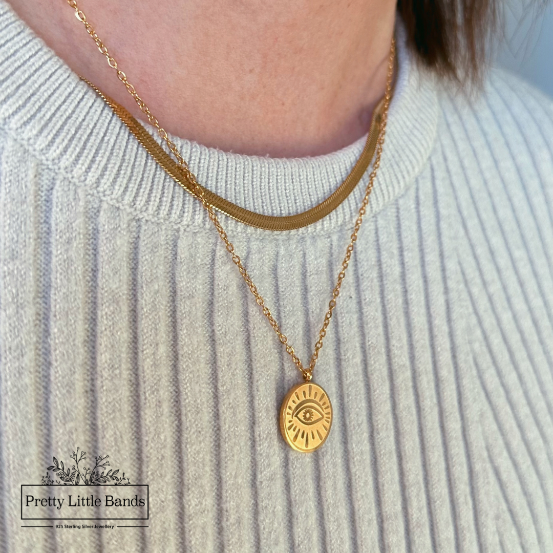Our dainty Evil Eye Pendant Necklace features an engraved pendant on simple gold chain.