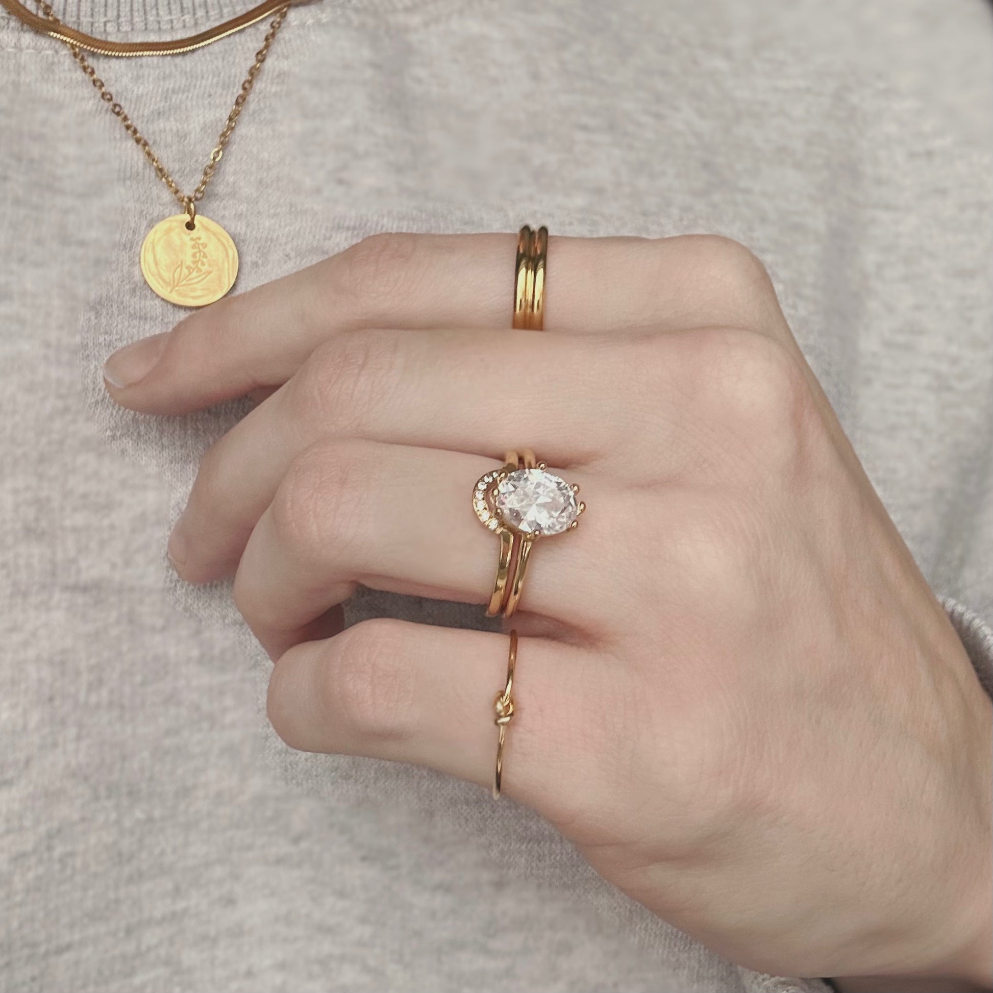Pair our Half Moon Nesting Ring with our new Oval Crystal Solitaire as a wedding band replacement for traveling or special events.