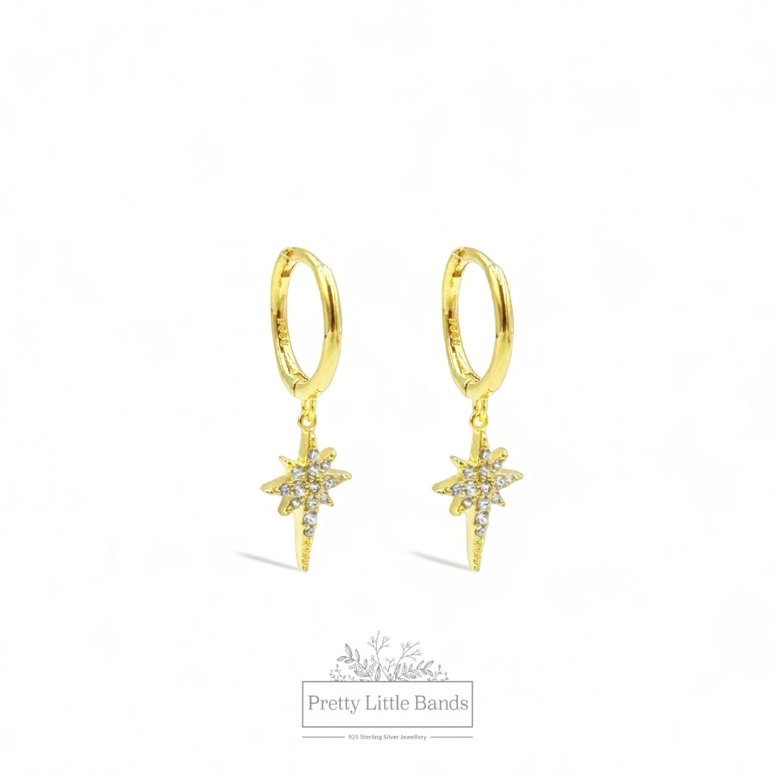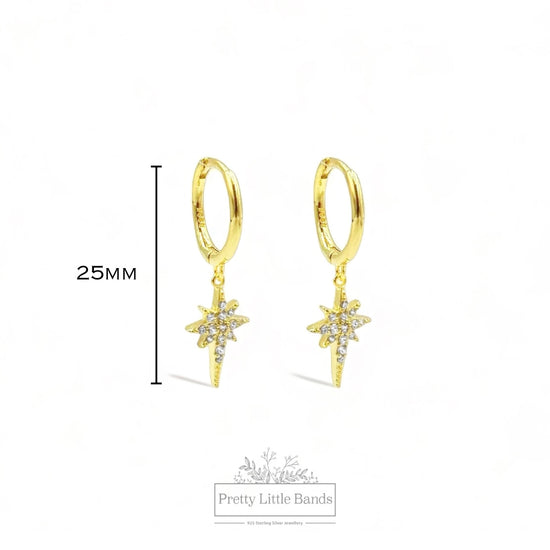 Upgrade your earring game with our North Star Huggie style hoop earrings. Made with 925 sterling silver and filled with 18k gold, these dainty earrings feature sparkling cubic zirconia crystals. The hinge style design allows for easy wear and all-day comfort.