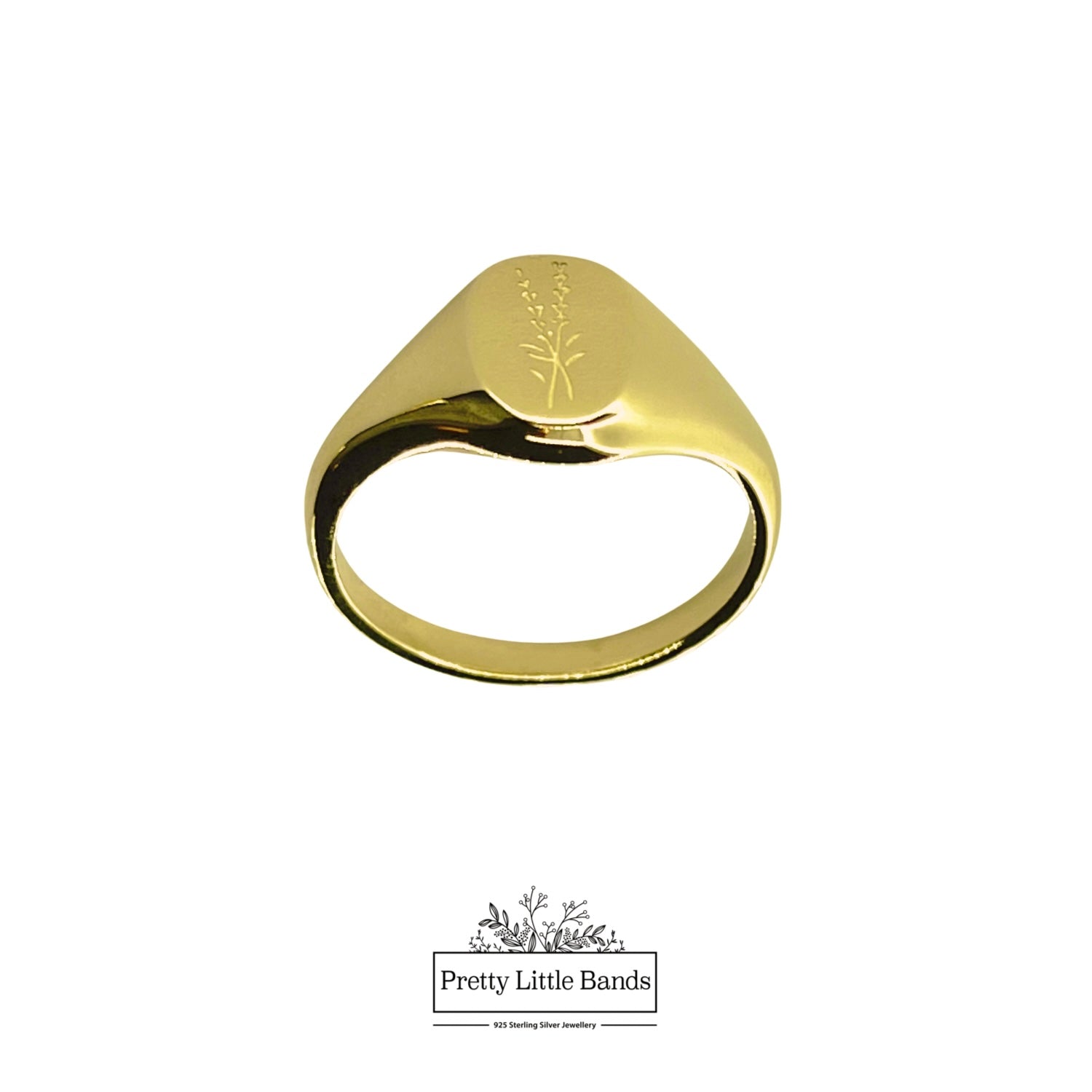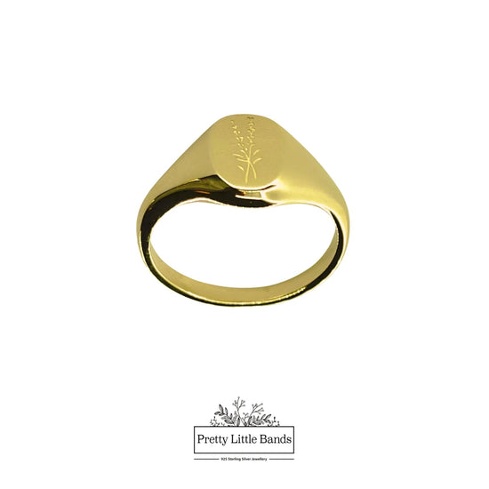 This beautiful Lavender Signet Ring is made of high quality 18K gold filled stainless steel. This piece features a delicate engraving of a Lavender plant.